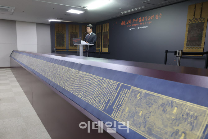 [이데일리 이영훈 기자] 최응천 국가유산청장이 8일 서울 종로구 국립고궁박물관에서 열린 '불교미술의 진수, 고려 사경과 조선 불화의 귀환' 일본 환수 문화재 언론 공개 행사에서 인사말을 하고 있다.