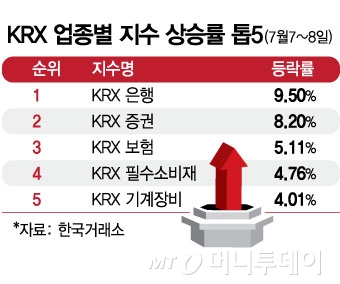 7월 7~8일 KRX 업종별 지수 상승률 톱5./그래픽=김현정 디자인 기자 |