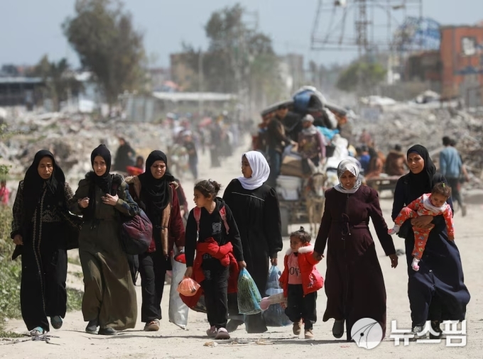 [가자 로이터=뉴스핌] 장일현 특파원 = 19일(현지시간) 팔레스타인 가자지구 주민들이 이스라엘군의 대피 명령에 따라 피란길에 오르고 있다. 2025.03.19 ihjang67@newspim.com |