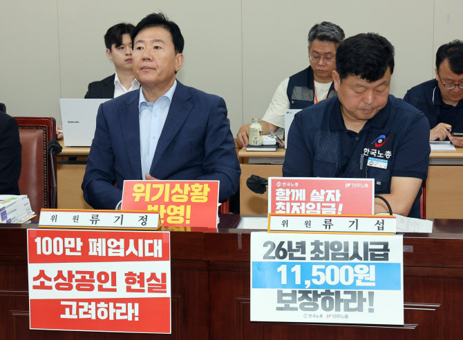 최저임금위원회 사용자위원인 류기정 한국경영자총협회 전무(왼쪽)와 근로자위원인 류기섭 한국노총 사무총장이 8일 정부세종청사에서 열린 최저임금위원회 제10차 전원회의에서 나란히 자리하고 있다.(사진=연합뉴스) |