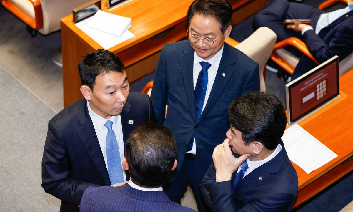 김용민 법사위 간사가 3일 오후 서울 여의도 국회에서 열린 제426회국회(임시회) 제4차 본회의에서 김병기 더불어민주당 대표 직무대행 겸 원내대표, 문진석 원내수석, 허영 원내정책수석부대표와 대화하고 있다. 뉴스1 |