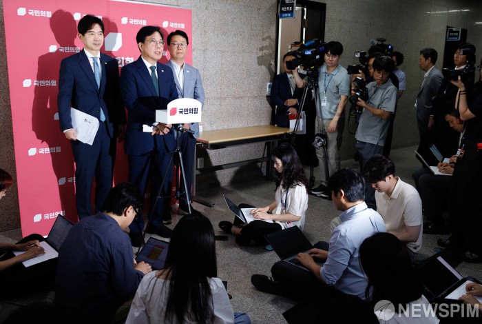 [서울=뉴스핌] 윤창빈 기자 = 송언석 국민의힘 비상대책위원장 겸 원내대표가 9일 오후 서울 여의도 국회에서 새 혁신위원장을 발표하고 있다. 이날 송 비대위원장은 혁신위원장에 윤희숙 여의도연구원장을 선임했다. 2025.07.09 pangbin@newspim.com