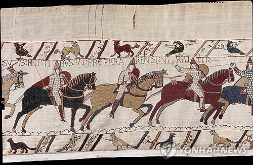 (서울=연합뉴스) 김연숙 기자 = '정복왕' 윌리엄의 잉글랜드 정복 과정을 세밀히 묘사한 초대형 자수 작품 '바이유 태피스트리'가 900여 년 만에 프랑스 땅을 벗어나 영국에서 전시될 예정이다.