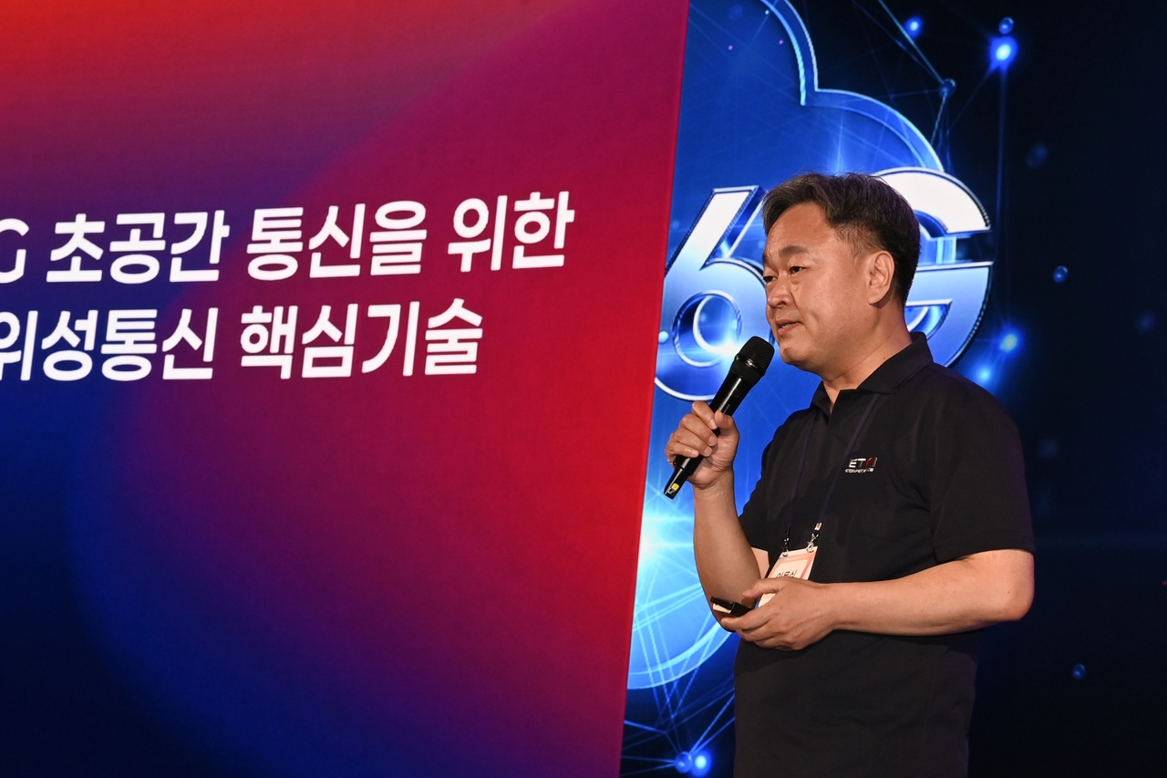 이문식 한국전자통신연구원 이동통신연구본부장이 ‘ETRI 콘퍼런스 2025’에서 6G 초공간 통신을 위한 위성통신 핵심기술에 관해 발표하고 있다. [한국전자통신연구원 제공] |