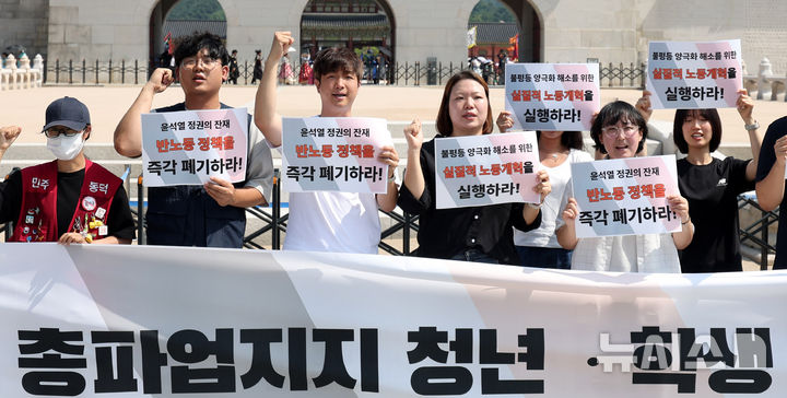 민주노총과 청년·학생 단체들은 9일 오전 서울 광화문 월대 앞에서 '민주노총 총파업 지지 청년학생 기자회견'을 열고 "윤석열 정부의 반노동 정책을 폐기하고 모든 노동자의 권리를 보장하라"고 목소리를 높였다.