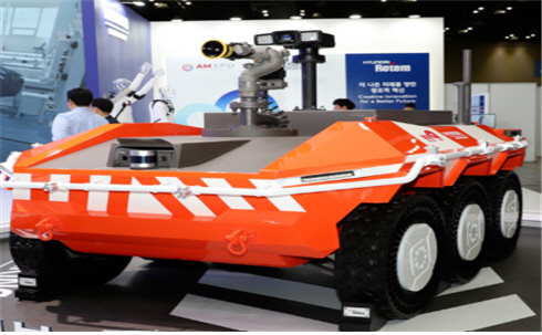 현대로템의 군사용 다목적 무인차량을 기반으로 개발된 무인소방로봇./현대로템 |