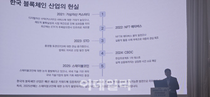 류 회장은 “2021년 커스터디, 2022년 NFT, 2023년 STO, 2024년 CBDC, 올해는 스테이블코인으로 2019년부터 블록체인 기술은 키워드만 바뀌고 제자리걸음을 하고 있는 것 같다”라며 “이번에 스테이블코인을 하겠다고 하니 회사내에서는 또 안되는 것 아니냐는 회의적인 시각이 있다”라고 지적했다.