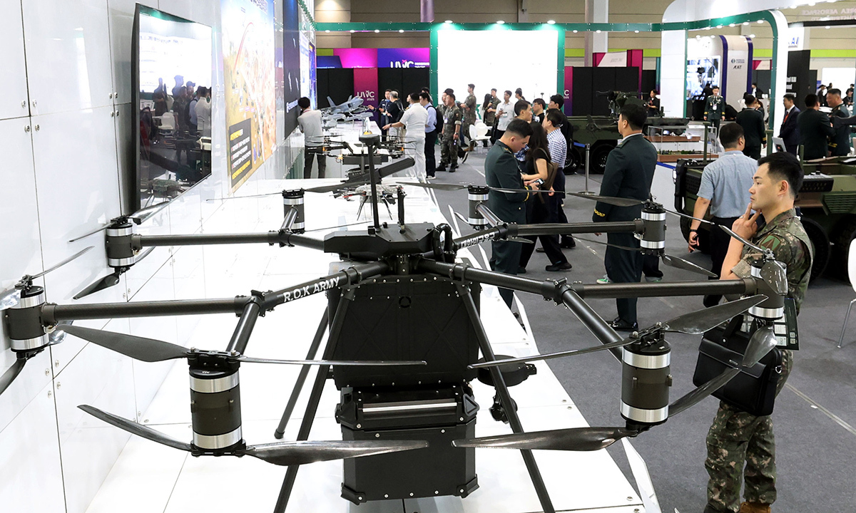 9일 서울 강남구 코엑스에서 열린 ‘2025 무인이동체산업엑스포’에서 관람객들이 국군 홍보 부스를 찾아 드론과 무인비행체 등을 살펴보고 있다.