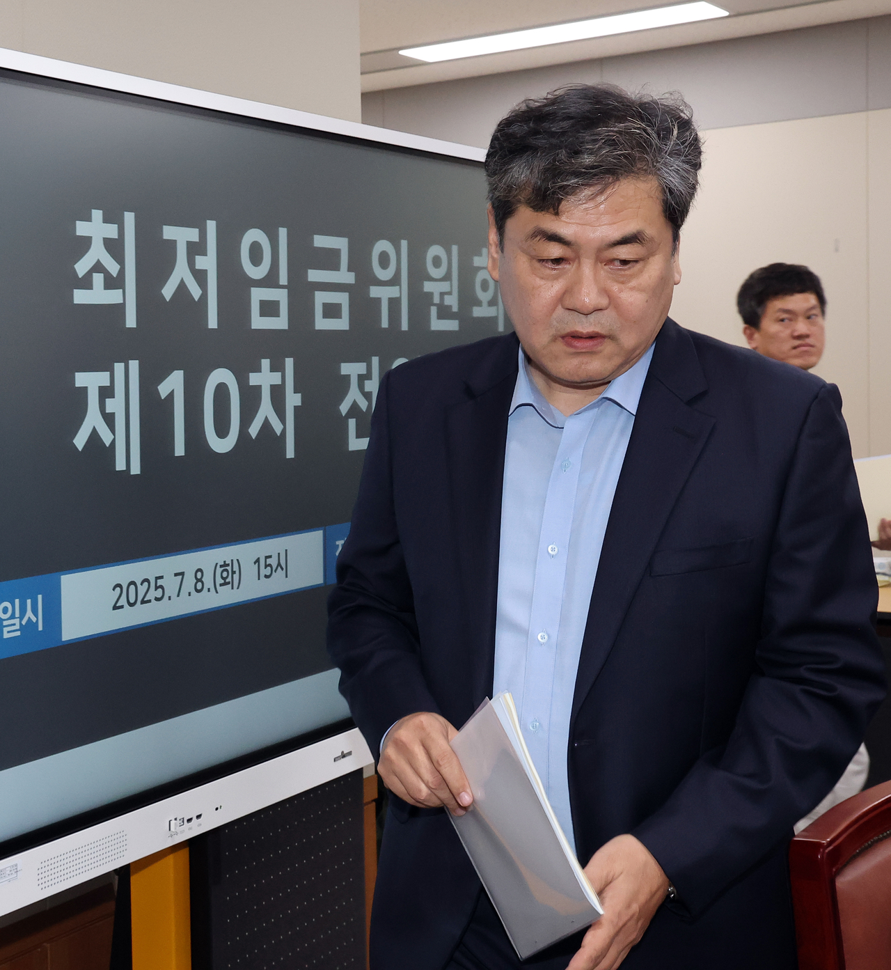 이인재 최저임금위원장이 8일 정부세종청사에서 열린 최저임금위원회 제10차 전원회의에 입장하고 있다. [연합] |