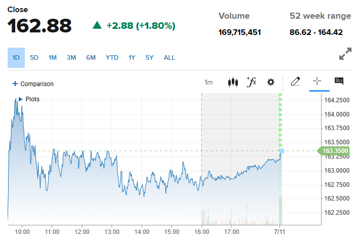엔비디아 주가 추이. 9일(현지시간) 종가 162.88달러. 출처 CNBC |
