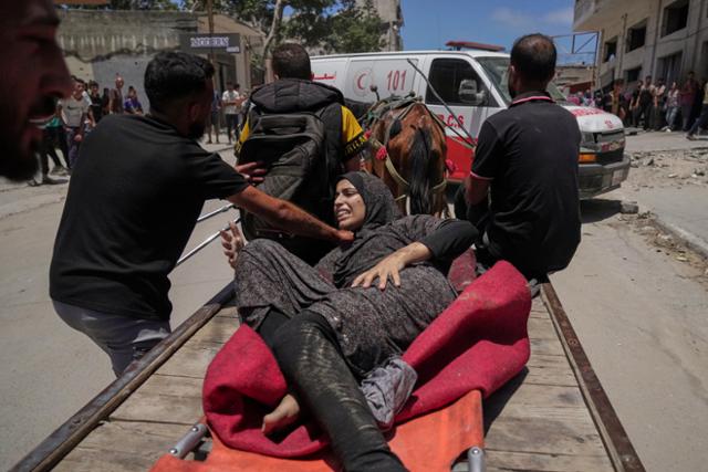 8일 팔레스타인 가자지구 가자시티에서 이스라엘의 공습으로 피란민들이 머물던 천막이 공격을 받은 뒤 한 여성이 들것에 실려 대피하고 있다. 가자시티=AP 뉴시스 |