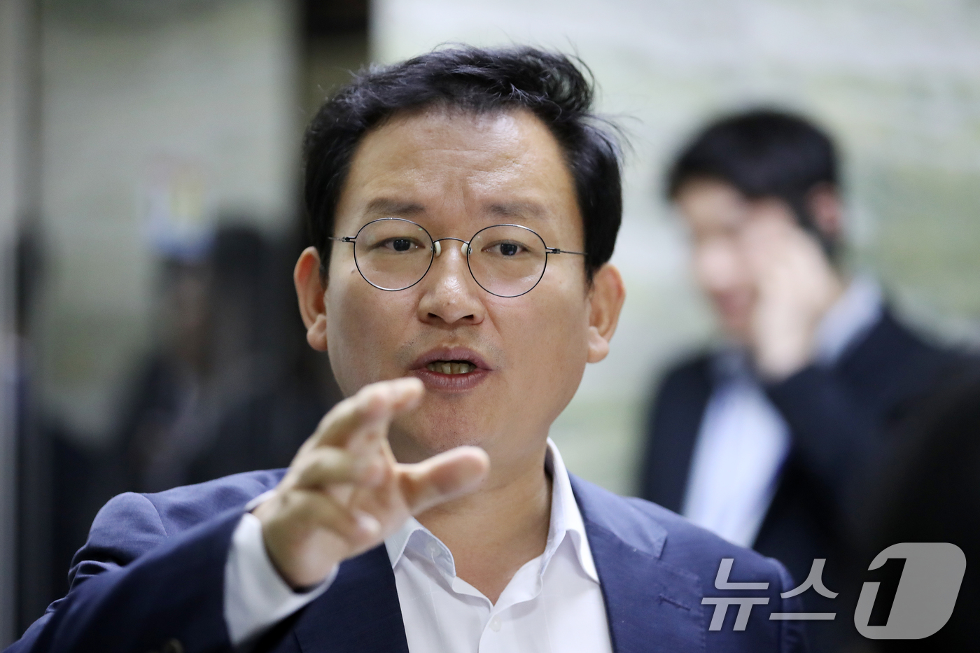 김형동 국회 환경노동위원회 국민의힘 간사가 지난해 7월16일 서울 여의도 국회에서 열린 환경노동위원회 제2차 고용노동법안심사소위원회를 마치고 취재진의 질의에 답하고 있다. 이날 환노위 고용노동소위에선 야당 단독으로 노란봉투법이 의결됐다. 2024.7.16/뉴스1 ⓒ News1 이승배 기자 |