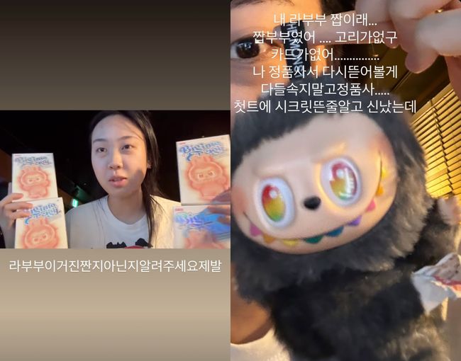 이영지는 “여러분 알려주세요 진짠가요 이거”라고 물은 뒤 “내 라부부 짭이래.. 짭부부였어”라고 사기를 당했다고 고백했다. 이어 “고리가 없구 카드가 없어. 나 정품사서 다시 뜯어볼게 다들 속지말고 정품 사… 첫트(첫 시도)에 시크릿 뜬 줄 알고 신났는데”라고 아쉬움을 토로했다.
