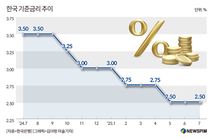 한은 금통위는 이날 7월 통화정책방향 회의를 열고 기준금리 동결을 의결했다. 미국 연방준비제도(Fed)가 지난 6월 공개시장위원회(FOMC)에서 기준금리를 연 4.5%에서 동결한 데 이은 것이어서 한미 간 금리차는 역대 최대인 2.0%포인트(p)가 유지됐다.