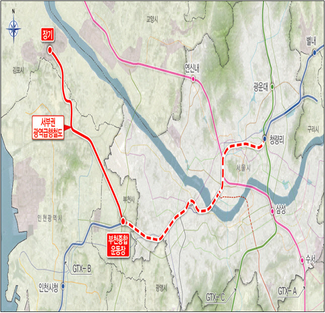 이번에 예타를 통과한 ‘서부관 광역 급행철도’(사업비 2조 6710억원)는 김포시 장기역에서 인천 검단·계양, 부천 대장을 거쳐 청량리역까지 운행하는 급행철도를 건설하는 사업이다. 교통수요를 분산해 김포골드라인 등 수도권 서부 지역의 출퇴근시 혼잡을 낮추고 서울 도심으로의 접근성을 개선할 것으로 기대된다.