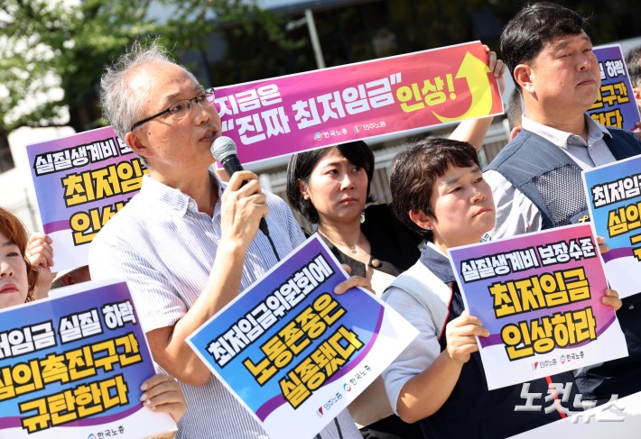 10일 오전 서울 용산구 대통령실 앞에서 양대노총 관계자들이 최저임금 심의촉진구간 규탄 기자회견을 갖고 있다. 최근 최저임금위원회 공익위원들은 최저임금 인상폭 논의의 상·하한선을 제한하는 '심의촉진구간'을 제시했다. 제시된 구간은 시급 1만 210원~1만 440원으로, 올해 최저시급 1만 30원과 비교하면 1.8%(180원)~4.1%(410원) 인상되는 수준이다. 내년도 최저임금은 10일 열리는 제12차 전원회의에서 정해질 것으로 전망된다.
