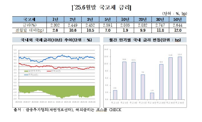 금융투자협회가 10일 발표한 '2025년 6월 장외채권시장 동향'에 따르면 지난달 말 기준 국고채 3년물 금리는 2.452%로, 전월 말 대비 10.5%포인트(p) 올랐다. 5년물 2.591%, 10년물 2.805% 등도 각각 전월 말 대비 7%p, 1.9%p 오르는 등 일제히 상승했다.