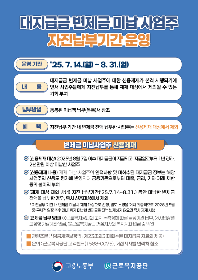 이는 지난해 8월 임금채권보장법 개정으로 대지급금 변제금 미납 사업주에 대한 신용제재가 도입됨에 따라, 올해부터 본격적인 제재가 시행되기에 앞서 사업주들에게 자진 납부를 통해 제재 대상에서 제외될 수 있는 기회를 주기 위한 것이다.