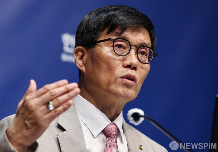 [서울=뉴스핌] 사진공동취재단 = 이창용 한국은행 총재가 10일 오전 서울 중구 한국은행에서 열린 통화정책방향 기자간담회에서 취재진 질문에 답하고 있다. 2025.07.10 photo@newspim.com |