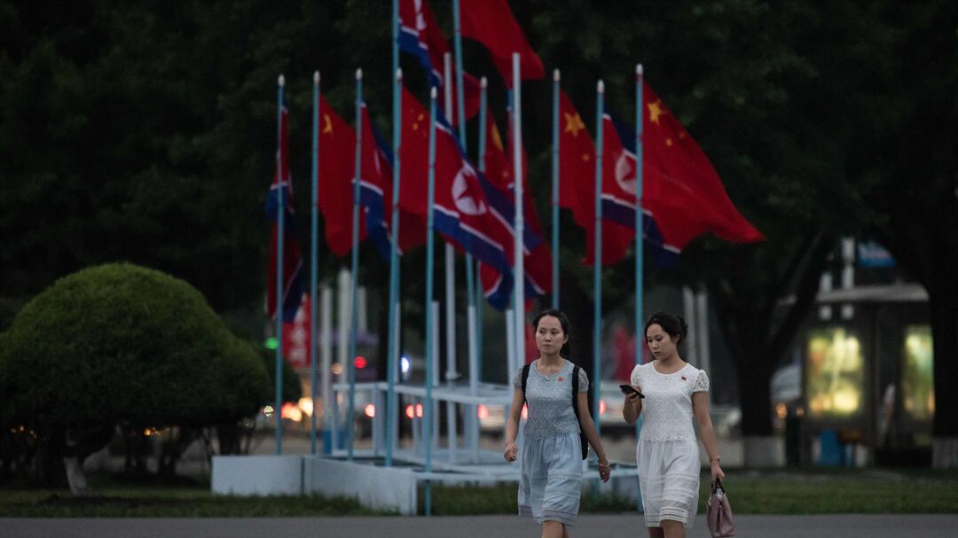 평양의 한 거리에 북한 인공기와 중국 오성홍기가 펄럭이고 있는 모습. /AFP 연합뉴스 |