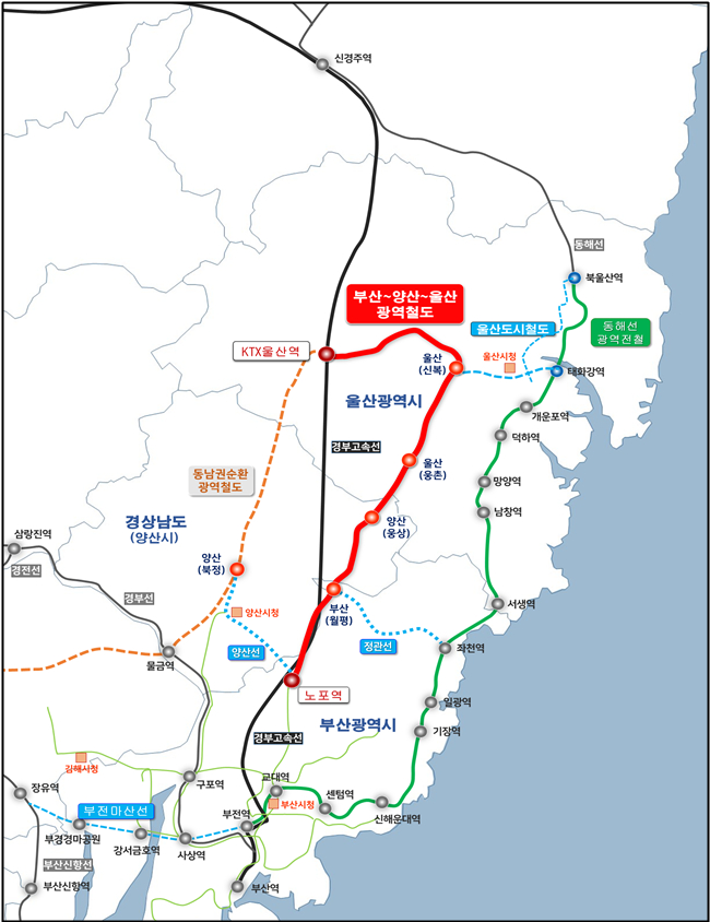 부산~양산~울산 광역철도는 총연장 47.6㎞ 로 부산 노포역에서 경남 양산(웅상)을 거쳐 KTX 울산역을 연결한다. 구간 내 11개 정거장을 설치하며 총사업비는 2조5475억원이다. 전체 구간을 45분 만에 연결하며 하루 35회 운행할 계획이다.
