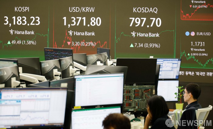 [서울=뉴스핌] 류기찬 인턴기자 = 코스피가 나흘째 올라 3,180대에 장을 마치며 다시 한번 연고점을 경신한 10일 오후 서울 중구 하나은행 딜링룸 전광판에 코스피, 원/달러 환율, 코스닥 지수가 표시되고 있다. 이날 코스피 지수는 전 거래일 대비 49.49포인트(1.58%) 오른 3,183.23에, 코스닥은 7.34포인트(0.93%) 오른 797.70에 장을 마감했다. 2025.07.10 ryuchan0925@newspim.com