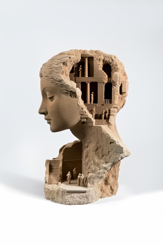 전시장에는 고대 신화에서 한 번쯤 본 듯한 젊은 여성의 흉상이 놓여 있다. 그런데 이 여성의 두개골 한쪽 측면과 흉부 인근에 고대 신전 혹은 도시처럼 보이는 구조물이 세밀하게 가공돼 있다. 성인 남자 몸통 크기의 흉상에서 일반적으로 생각할 수 없는 부위에 고고학적 발굴을 넣은 것과 같은 모습이다.