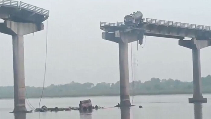 다리가 무너지면서 다리 위를 달리던 차량 4대가 강으로 추락했고 트럭 1대는 가까스로 다리 끝에 걸렸습니다.