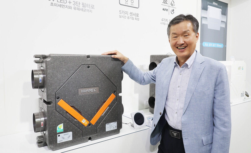 김정환 힘펠 대표가 힘펠의 대표 전열환기 시스템 '휴벤' 앞에서 포즈를 취했다. 전열환기 시스템은 냉난방열을 회수해 탄소 감축에도 도움을 주는 제품이다. 이충우기자 |