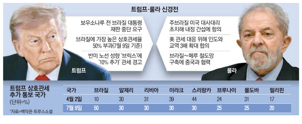 트럼프 대통령은 9일(현지시간) 사회관계망서비스(SNS) 트루스소셜에 루이스 이나시우 룰라 다시우바 브라질 대통령에게 관세 서한을 보냈다. 그는 서한에서 자이르 보우소나루 전 브라질 대통령이 재판에 계류 중인 상황을 "국제적인 불명예"라고 언급하면서 "이 재판은 열려서는 안 된다. 마녀사냥은 즉시 끝나야 한다"고 썼다.