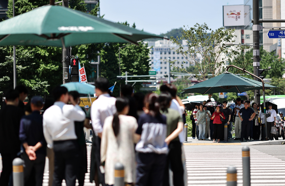 무더위가 이어지는 10일 서울 세종로 사거리에서 시민들이 햇빛 가림막 아래에서 신호를 기다리고 있다. 연합뉴스 |