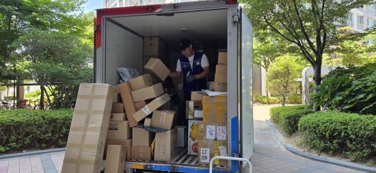 낮 기온 36도를 웃도는 무더위가 지속된 9일 오후 광주 광산구 한 아파트 단지에서 손승곤(43) 씨가 탑차에 올라타 택배 분류작업을 하고 있다. 민찬기 기자 |