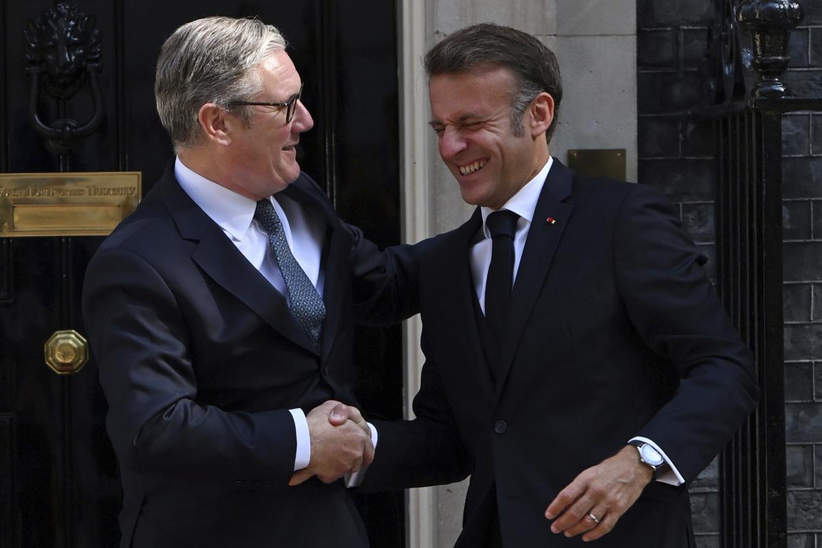 키어 스타머 영국 총리(왼쪽)와 에마뉘엘 마크롱 프랑스 대통령이 9일 영국 런던의 총리 관저에서 만나 악수하고 있다. 두 정상은 이날 최초로 양국의 핵무기 사용 협력에 전격 합의했다. 런던=AP뉴시스 |