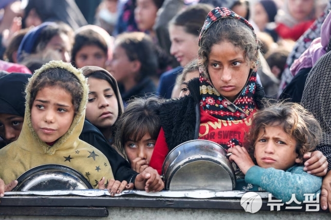 [가자 로이터=뉴스핌] 장일현 특파원 = 가자지구 남부 도시 칸유니스에서 팔레스타인 어린이들이 식량 배급을 받기 위해 줄을 서 있다. 지난 1월 17일(현지시간) 촬영된 사진이다. 2025.05.21. ihjang67@newspim.com |