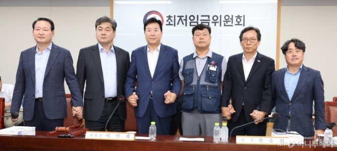[세종=뉴시스] 강종민 기자 = 최저임금위원회 이인재 위원장과 권순원 공익위원, 류기정 사용자 위원, 류기섭 근로자 위원 등이 지난 10일 밤 세종시 정부세종청사에서 2026년도 적용 최저임금안을 합의로 결정한 뒤 손을 맞잡고 있다. 내년도 최저임금은 1만 320원으로 결정됐다. 2024.07.11. ppkjm@newsis.com /사진=강종민 |