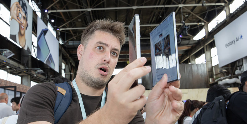 9일(현지 시간) 미국 뉴욕 듀갈 그린하우스에서 열린 ‘갤럭시 언팩’에서 한 관람객이 기존 제품과 갤럭시 Z 폴드7(오른쪽)의 두께를 비교해 보고 있다. 갤럭시 Z 폴드7은 접었을 때 8.9mm, 펼쳤을 때 4.2mm 두께에 215g의 무게로 역대 갤럭시 Z 폴드 시리즈 중 가장 얇고 가볍다. 삼성전자 제공 |