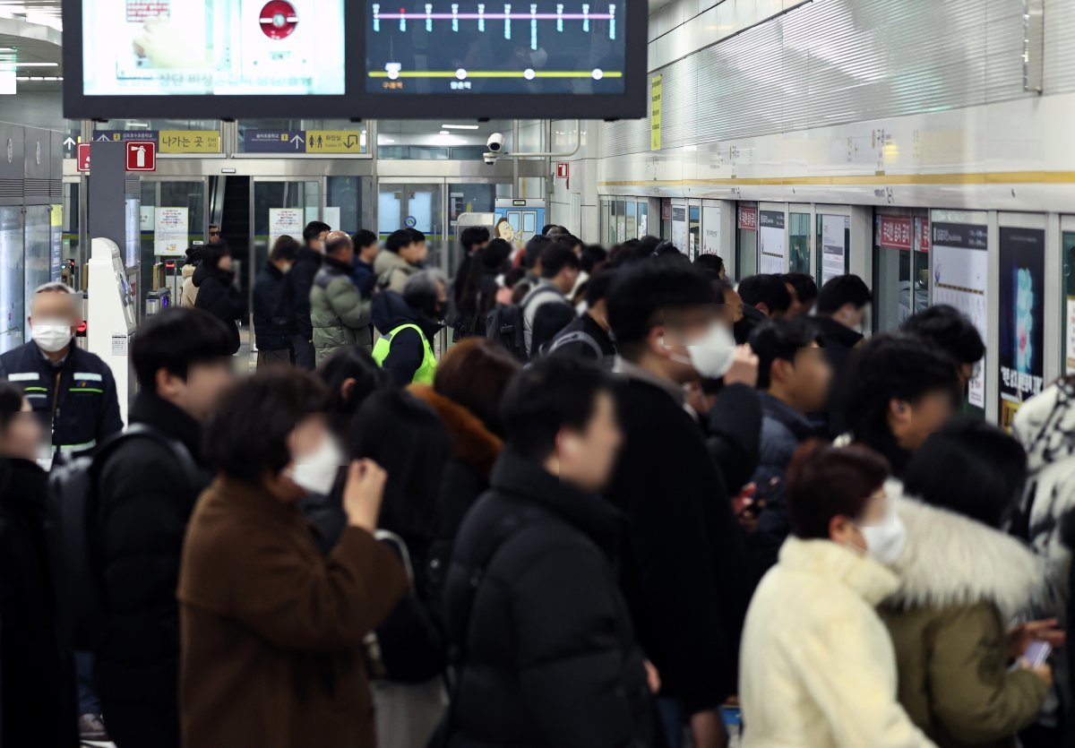 28일 오전 경기 김포시 김포골드라인 구래역에서 출근길에 오른 시민들이 열차를 기다리고 있다. 2023.12.28/뉴스1 |