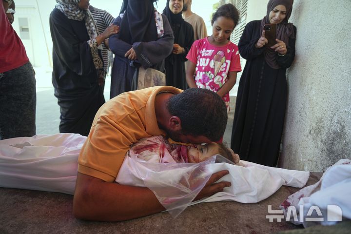 [가자지구=AP/뉴시스] 10일(현지 시간) CNN에 따르면 현지 의료 당국과 병원 관계자들은 가자지구 중부 데이르알발라의 한 보건센터 인근에 공습이 발생해 2~14살 사이 어린이 8명을 포함해 15명이 숨졌다고 밝혔다. 사진은 이번 이스라엘의 공습으로 숨진 딸의 시신 앞에서 슬퍼하고 있는 아버지의 모습. 2025.07.11. |