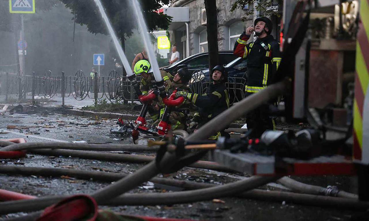 10일(현지시간) 우크라이나 키이우 지역에서 러시아의 드론 공격 이후 소방관들이 화재를 진압하고 있다. [UPI] |