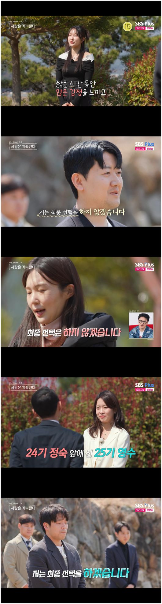 10일 방영한 ENA, SBS Plus 예능 ‘나는 SOLO, 그 후 사랑은 계속된다’(이하 ‘나솔사계’)에서는 최종 선택을 하루 앞두고 여성 선택의 데이트가 이뤄졌다. 25기 영호는 아쉬움에 눈을 질끈 감았다. 그러나 24기 정숙은 25기 영호와 진지한 대화를 해보고 싶다며 데이트에 선뜻 나섰다.