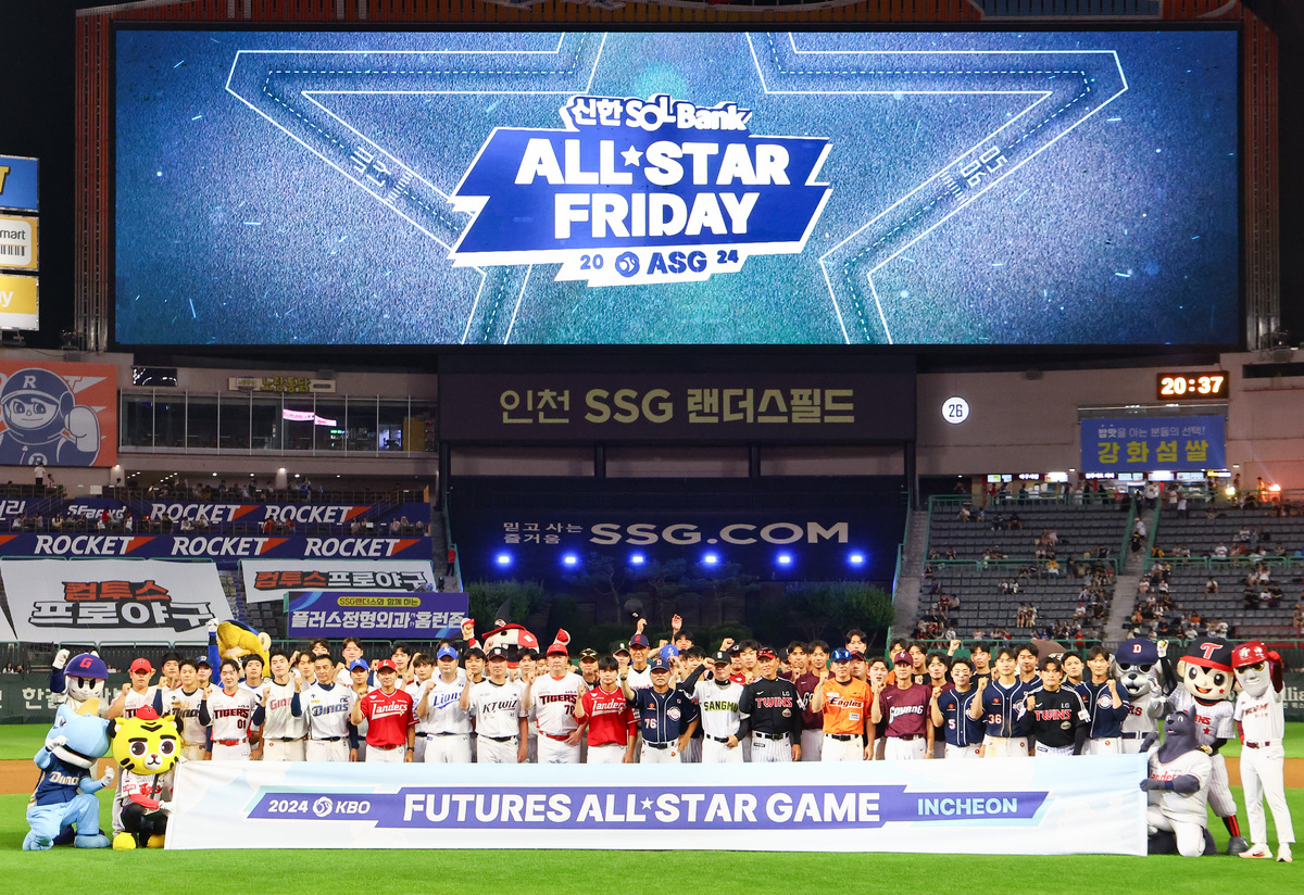 'KBO 올스타 프라이데이' 2024 퓨처스 올스타전에 참가한 북부 올스타와 남부 올스타 선수단이 경기를 마치고 기념촬영을 하고 있다. 사진=뉴시스 |