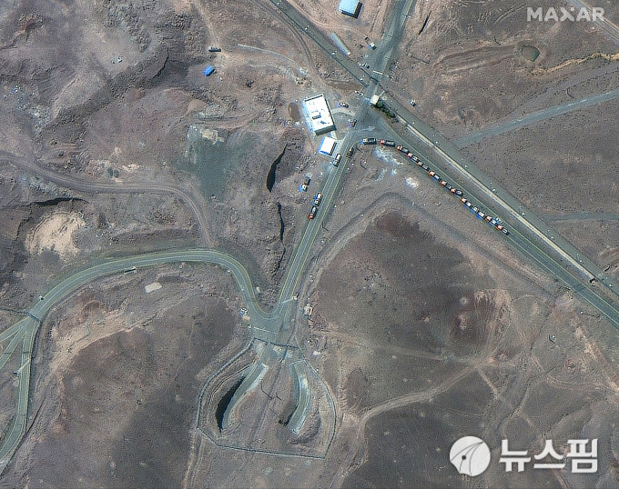 지난 19일(현지시간) 막사 테크놀로지가 촬영한 이란 포르도 핵 시설 입구에서 포착된 긴 트럭 행렬 위성 사진. [사진=로이터 뉴스핌] |