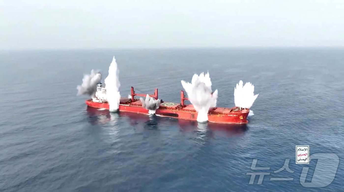 8일(현지시간) 예멘 후티 반군의 후티 미디어센터가 공개한 영상에서, 그리스 선사 소유 라이베리아 선적 화물선 '매직 시즈'로 추정되는 선박에서 연기와 물기둥이 솟아오르는 모습. 2025.07.08. ⓒ 로이터=뉴스1 ⓒ News1 윤다정 기자 |