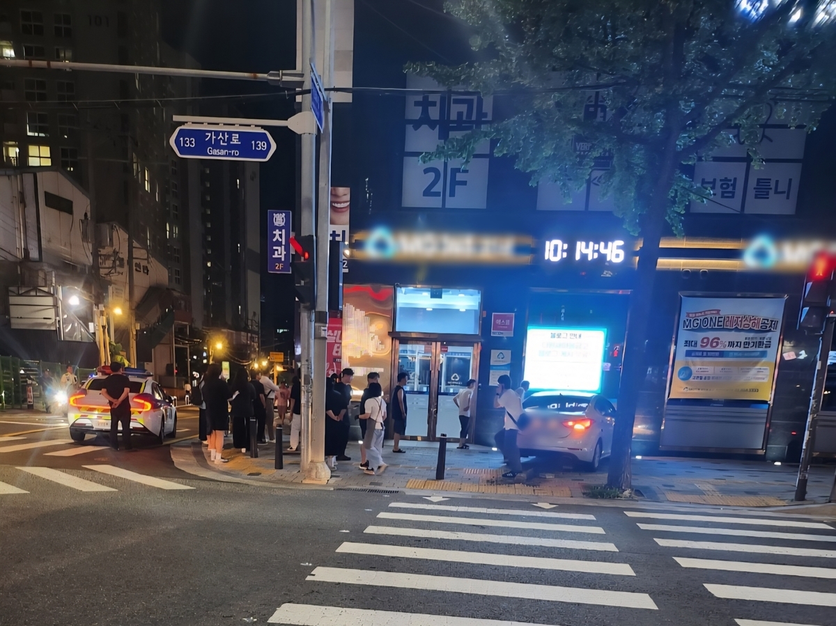 10일 밤 서울 금천구 가산동 거리에서 무면허 음주운전 차량이 인도를 들이받은 사고 현장에 경찰과 시민들이 모여 있다. 해당 차량 운전자는 20대 여성으로, '호기심에 운전했다'고 진술한 것으로 알려졌다. 사진=연합뉴스 |
