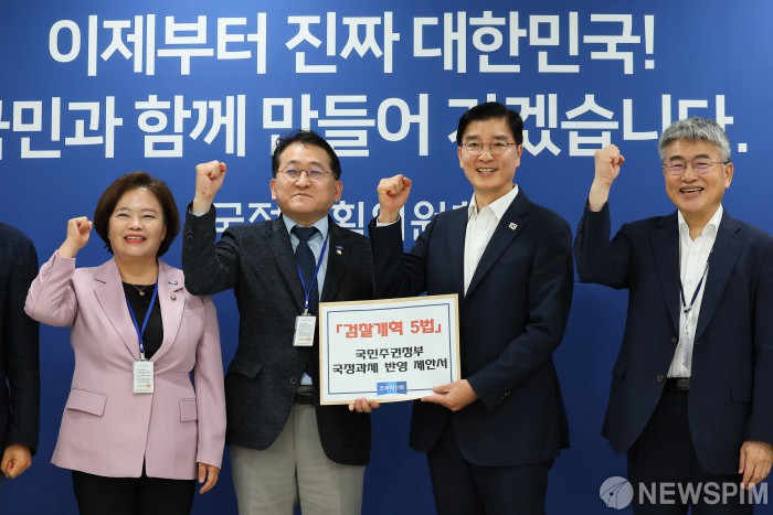 [서울=뉴스핌] 차규근 조국혁신당 최고위원(왼쪽에서 두번째)이 11일 오전 서울 종로구 국정기획위원회에서 열린 국정기획위원회 정치행정분과 - 조국혁신당 검찰개혁 간담회에서 이해식 정치행정분과장에게 '검찰개혁 5법 국민주권정부 국정과제 반영 제안서'를 전달하고 있다.[사진=국정기획위원회] 2025.07.11 photo@newspim.com