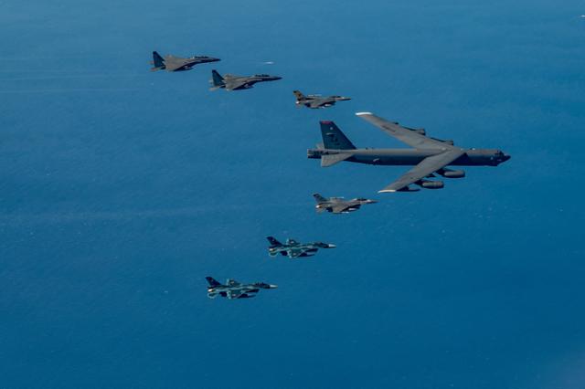 한미일 3국이 11일 제주도 남방 공해상에서 공중훈련을 실시했다. 이날 훈련엔 핵무장이 가능한 미 공군 최장수 전략폭격기인 ‘B-52H’가 참가한 가운데, 한국 공군의 KF-16 전투기와 일본 항공자위대의 F-2 전투기 등도 참여했다.