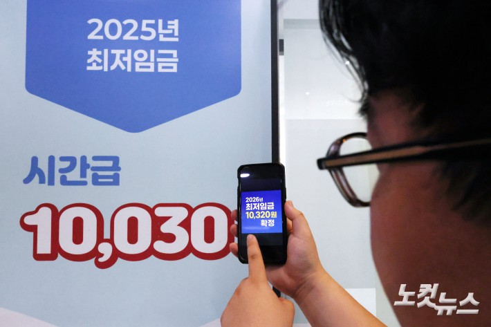 내년 최저임금이 올해보다 2.9% 오른 시간당 1만320원으로 결정된 가운데 11일 서울 마포구 서부고용복지플러스센터에 2025년 최저임금 안내판이 놓여 있다. 내년 최저임금은 2008년 이후 17년 만에 근로자·사용자·공익위원 합의로 결정됐다.