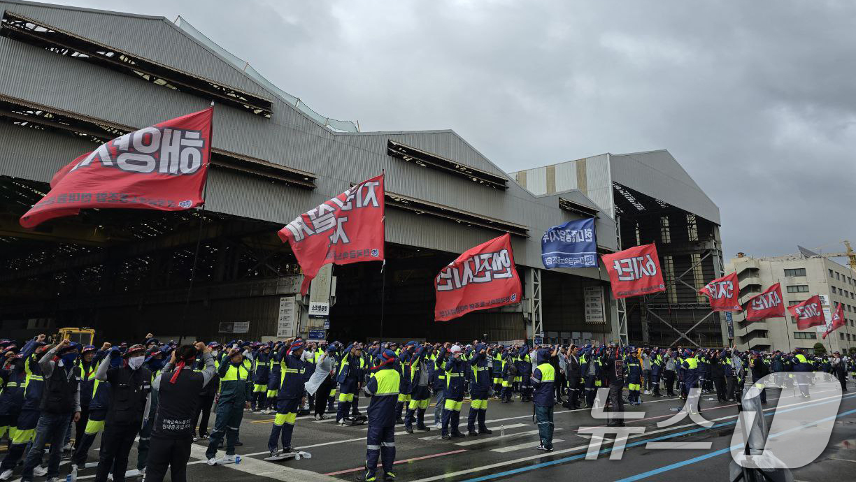(울산=뉴스1) 조민주 기자 = 사측과의 임금 및 단체협상에서 난항을 겪고 있는 HD현대중공업 노조가 올해 첫 파업에 돌입했다.