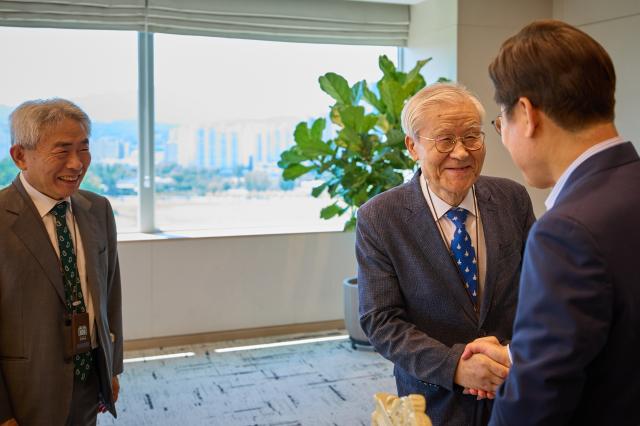 이재명 대통령이 11일 서울 용산 대통령실에서 정규재 전 한국경제신문 주필(왼쪽 첫번째) , 조갑제 조갑제닷컴 대표와 오찬 회동에 앞서 인사하고 있다. [사진=대통령실] |