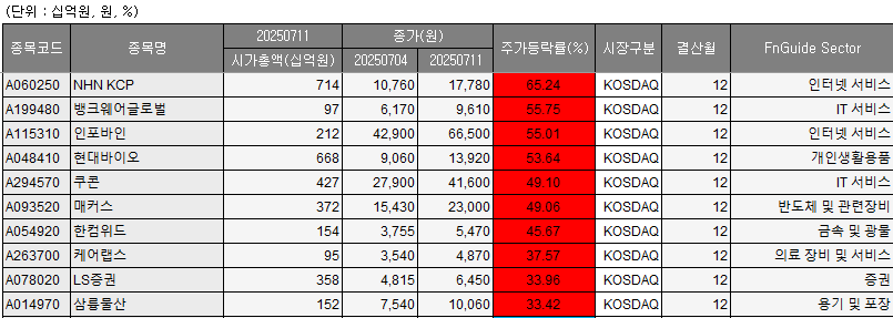 12일 에프앤가이드에 따르면 이번 주 코스닥 시장에서 가장 많이 상승한 종목은 NHN KCP로, 65.24% 증가한 1만7780원을 기록했다. 국내 1위 전자지급결제대행(PG)사인 NHN KCP는 스테이블코인 정착 시 최대 수혜를 볼 수 있다는 분석에 상승한 것으로 풀이된다.